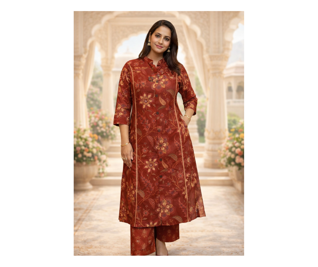 Dusky Red Floral Print Kurta Set with Palazzo – Elegant Women’s Ethnic Wear